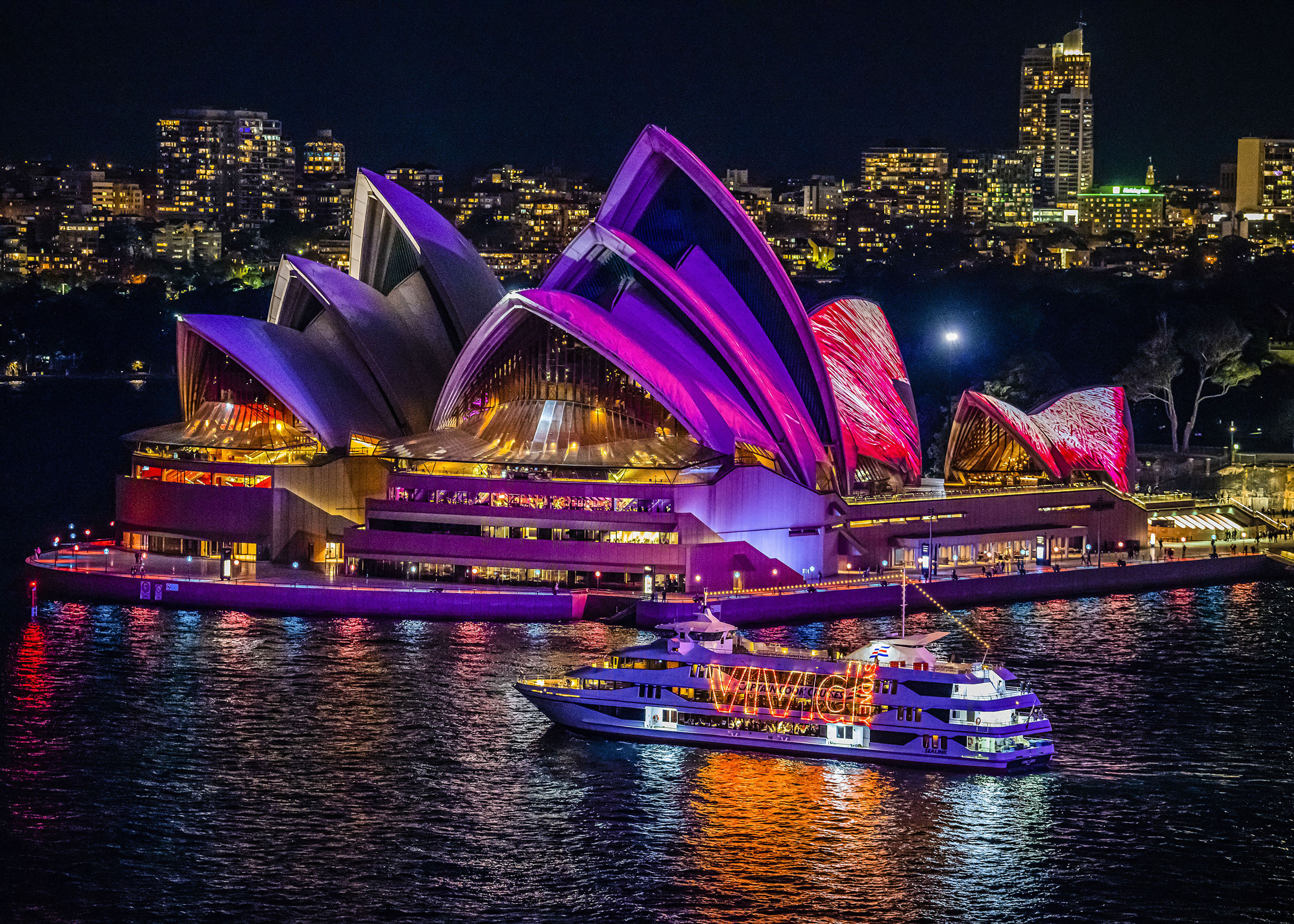 毎年5月から6月にかけて開催される南半球最大の都市型フェスティバル「Vivid Sydney」の期間に設定!街全体が幻想的な光に包まれる特別な時期にご案内します。さらに、イベントのハイライトであるシドニー湾のライトアップを、混雑知らずの「Vivid Sydneyサンセットディナークルーズ」で優雅に鑑賞。世界遺産オペラハウスやハーバーブリッジが光のキャンバスになる圧巻の景色を、船上からご覧いただけます。